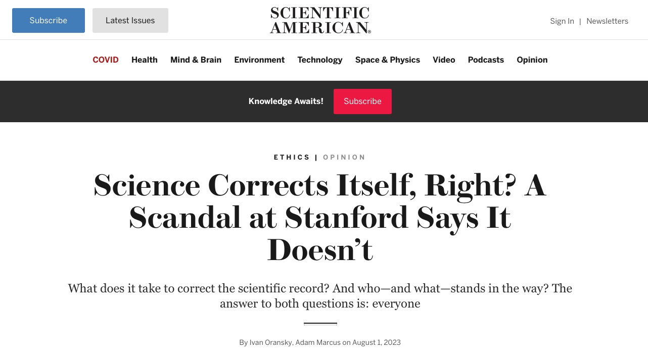 Oransky, I., & Marcus, A. (2023). Science corrects itself, right? A scandal at stanford says it doesn’t.