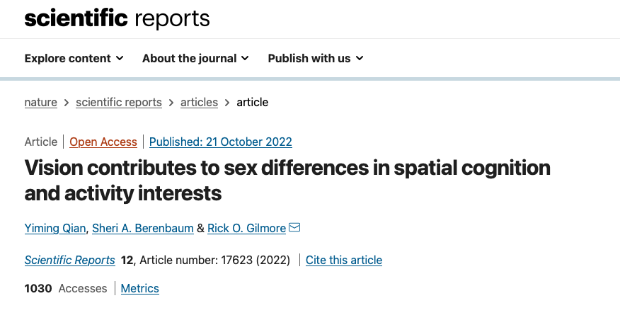 Qian, Y., Berenbaum, S. A., & Gilmore, R. O. (2022). Vision contributes to sex differences in spatial cognition and activity interests.